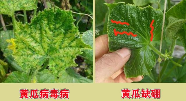 黃瓜病毒病跟黃瓜缺硼同樣都是葉片皺縮、畸形。但是,缺硼的時候,葉脈會明顯的變形,而發(fā)生病毒病時,葉脈幾乎不變形,通過這點也可以進行區(qū)分。