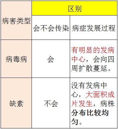真菌性病害和細(xì)菌性病害與缺素還是比較好區(qū)分的,不好區(qū)分的是缺素和病毒病。